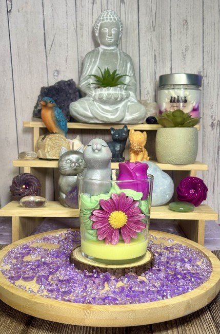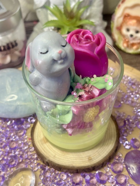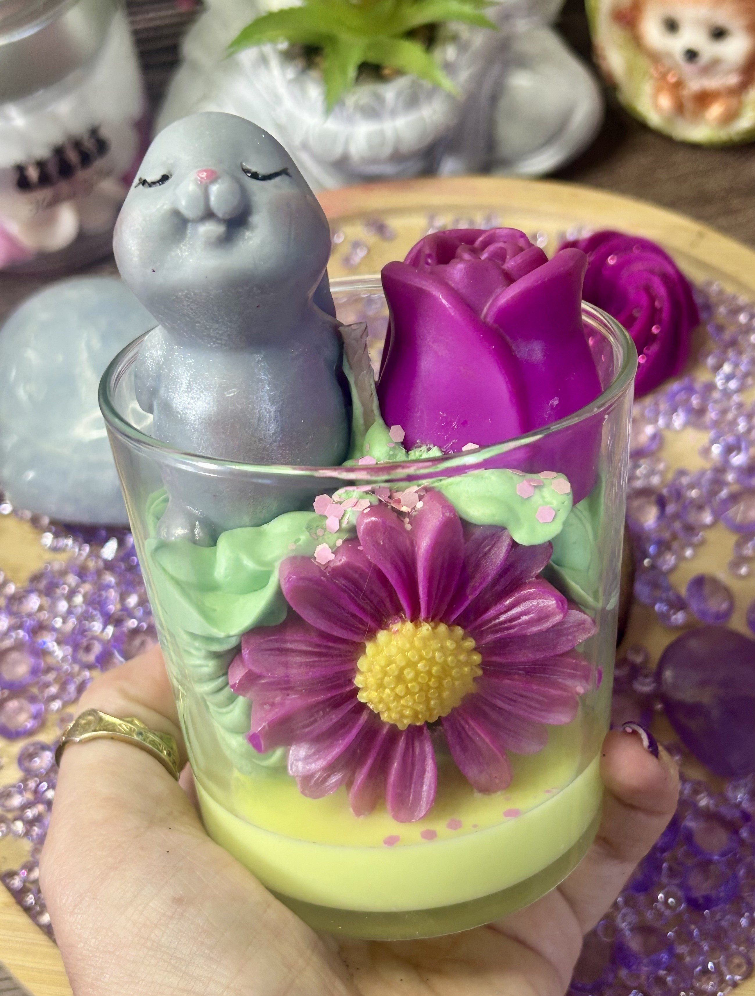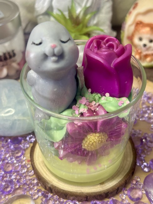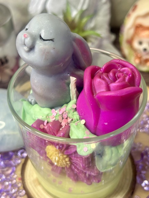 • Le petit Pan-Pan en cire grise nacrée,paisiblement envoûté par le parfum des fleurs!