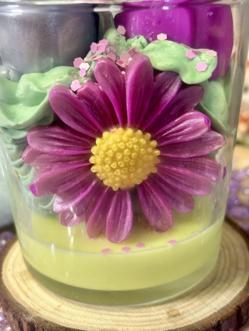 • Une Rose fuchsia sculptée et une Marguerite éclatante pour la touche florale.