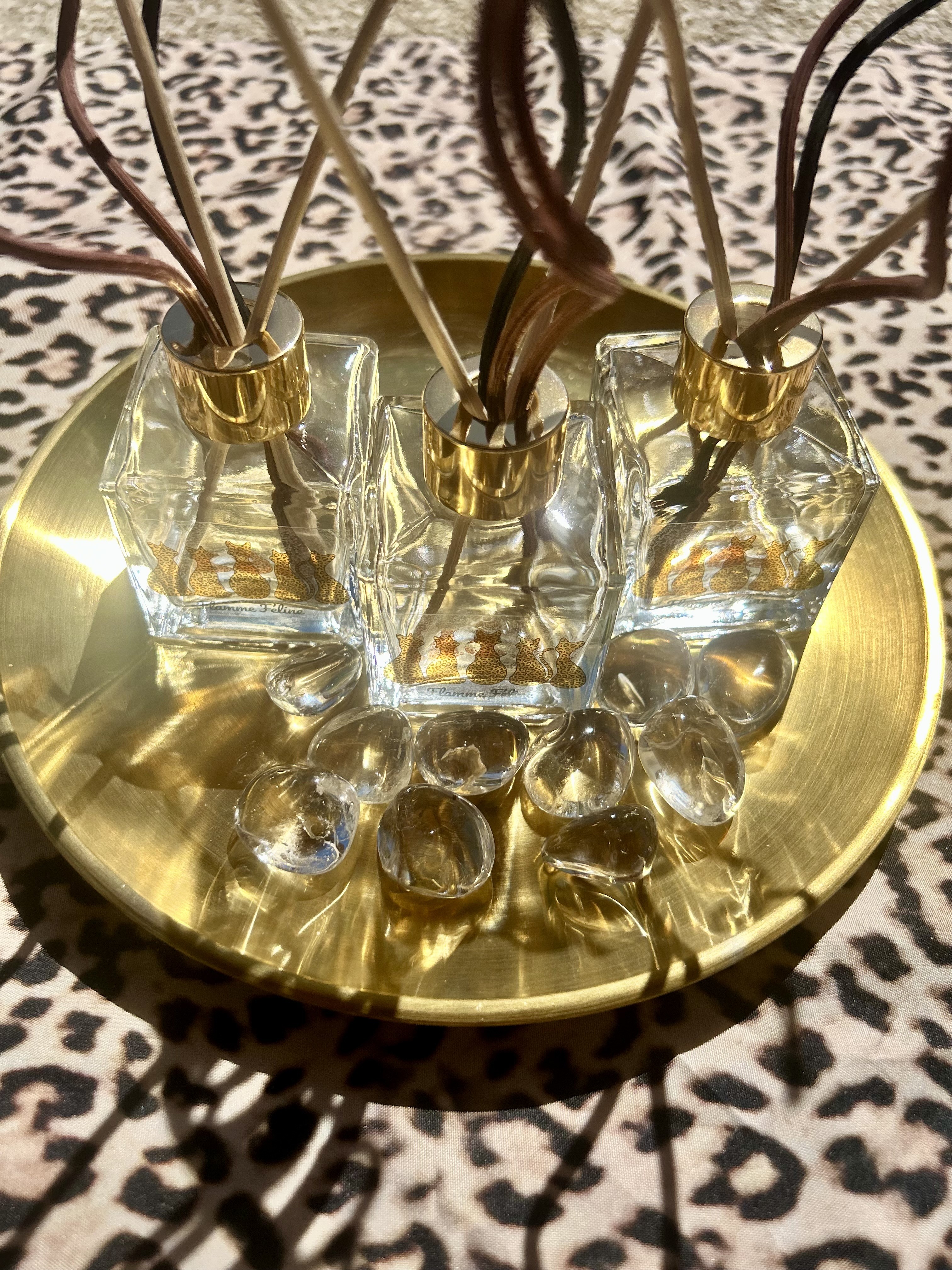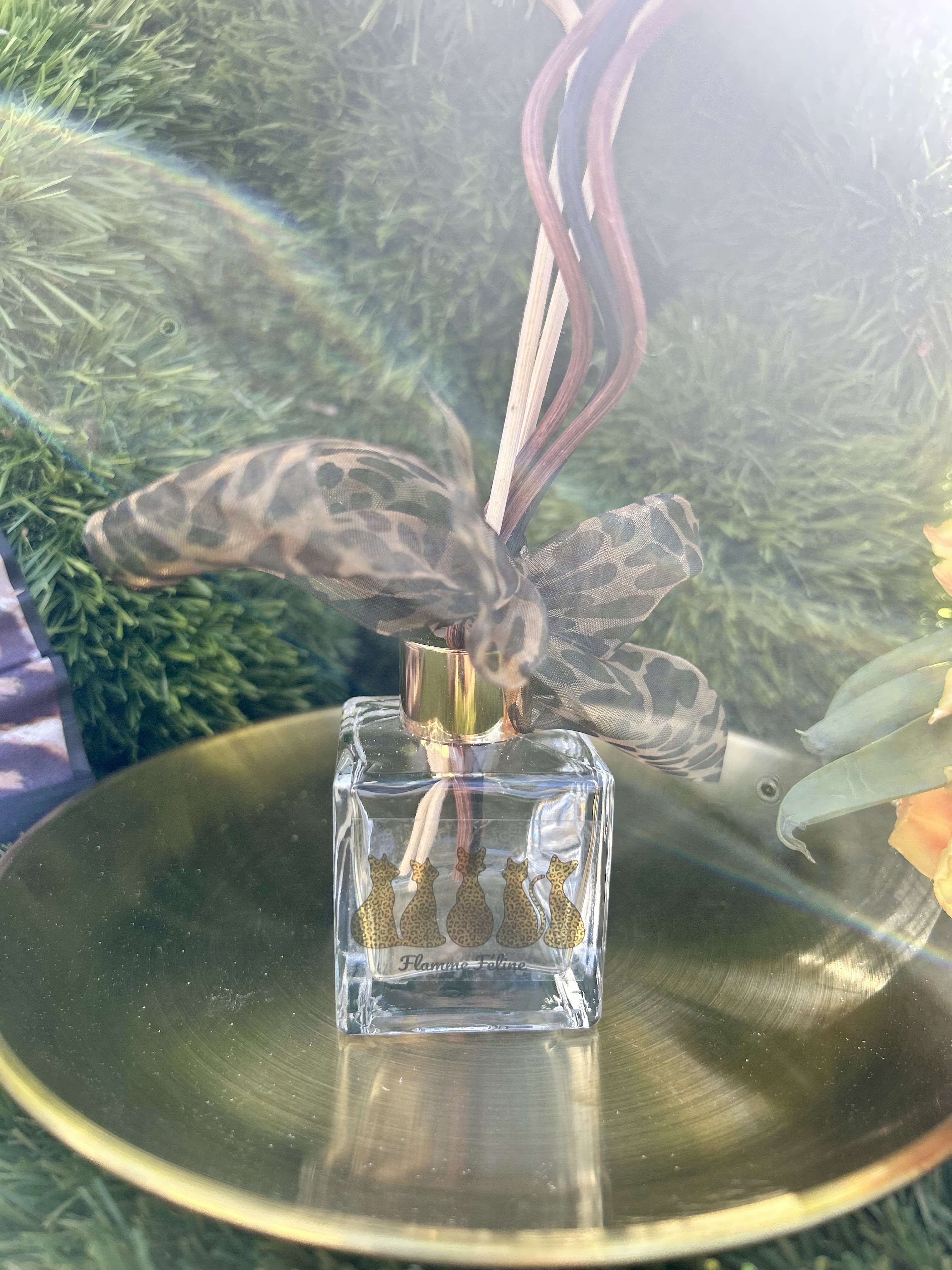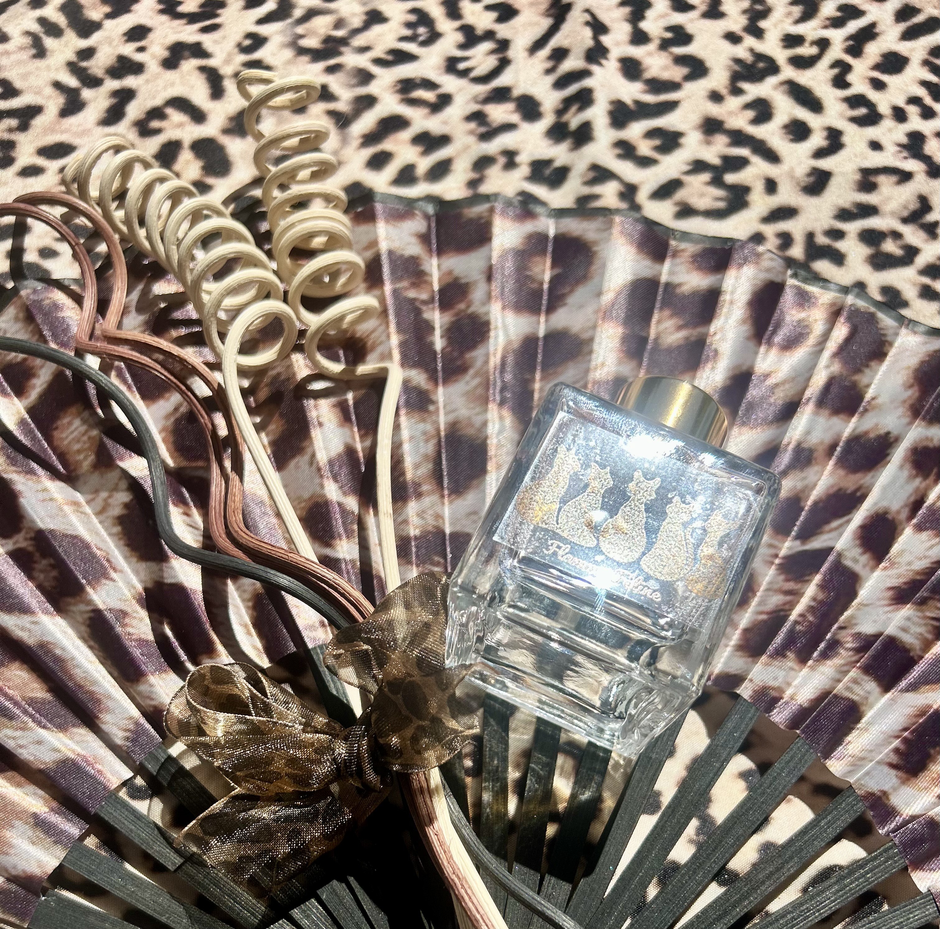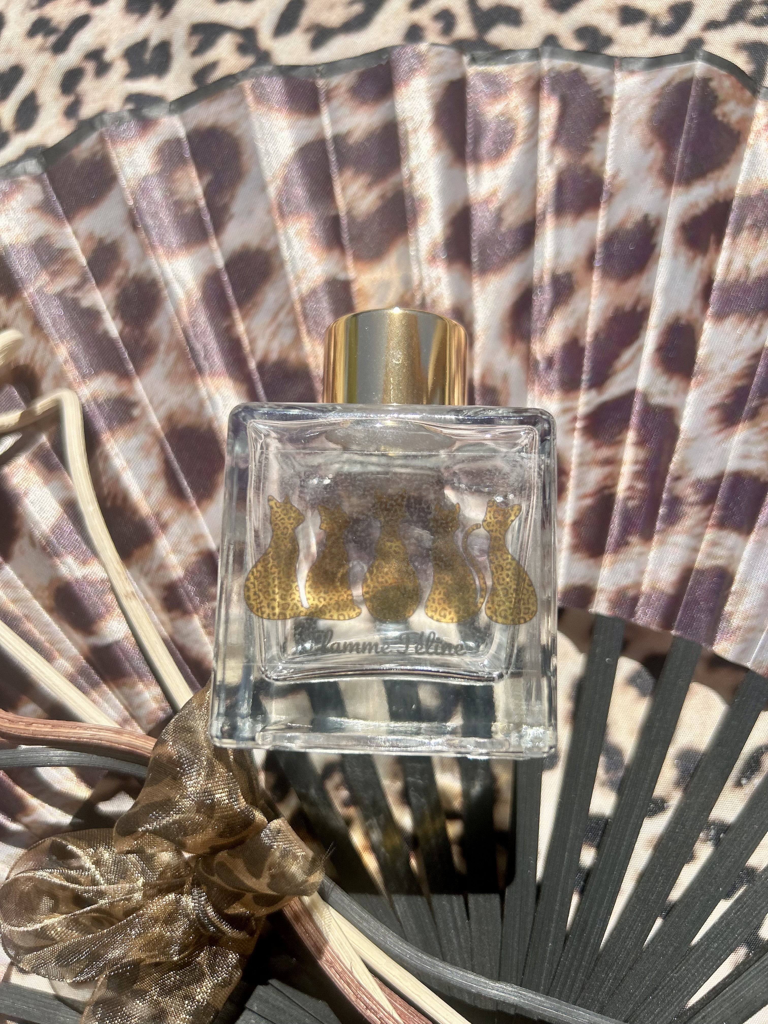 : Un flacon en verre élégant, orné de silhouettes de félins dorées, surmonté d'une bague brillante pour une touche luxueuse.